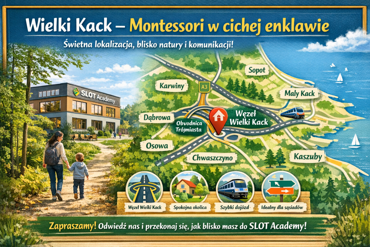 Dla mieszkańców Wielkiego Kacka, Małego Kacka, Karwin, Fikakowa, SLOT jest naturalnym, lokalnym wyborem. Wielki Kack zachował swój unikalny, spokojny klimat, co sprzyja edukacji w duchu Montessori – z dala od miejskiego zgiełku, w otoczeniu zieleni, a jednocześnie blisko domu. Spacer do placówki to dla wielu naszych sąsiadów codzienna przyjemność.